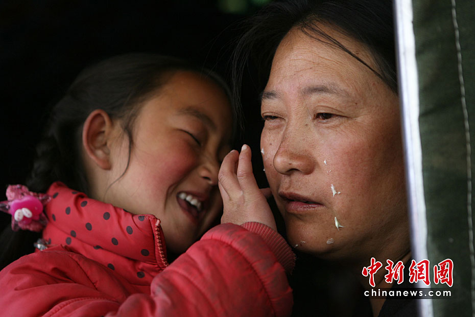 4月20日,青海省玉樹縣結(jié)古鎮(zhèn)紅旗小學(xué)一年級(jí)學(xué)生羅菁瑜在臨時(shí)帳篷里為媽媽涂雪花膏。他的爸爸出門到家中倒塌的廢墟里去尋找衣服等可用的物品。中新社發(fā) 蘇丹 攝