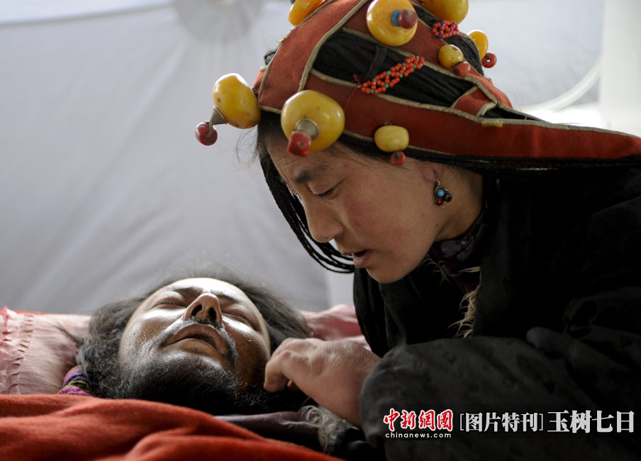 4月16日,青海玉樹體育場武警醫(yī)院醫(yī)療隊的帳篷里,東周丹增的妻子陪護丈夫接受治療。東周丹增在地震中肋骨骨折。 中新社發(fā) 廖攀 攝
