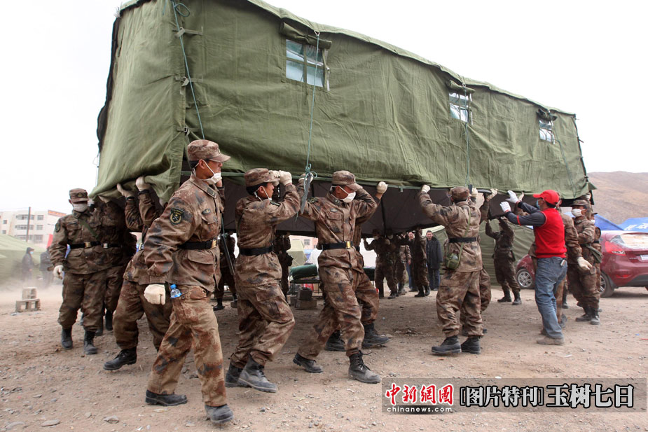 4月17日,青海玉樹體育場受災民眾安置點內,解放軍救援隊為安置點整體搬遷帳篷。中新社發 盛佳鵬 攝