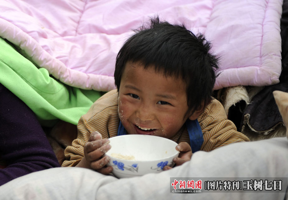 災(zāi)難的來臨無法選擇,但是面對災(zāi)難的方式,卻始終掌握在每個(gè)人自己手中。家園被毀,失去親人,傷痛過后生活還要繼續(xù),愿玉樹的受災(zāi)群眾選擇堅(jiān)強(qiáng),用堅(jiān)韌和信心去開創(chuàng)新的生活。 圖為青海玉樹體育場地震民眾安置點(diǎn),一名孩童歡快地吃東西。中新社發(fā) 廖攀 攝