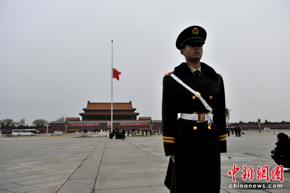 4月21日早晨,北京天安門(mén)廣場(chǎng)下半旗向玉樹(shù)地震遇難者致哀。中新網(wǎng)記者 金碩 攝