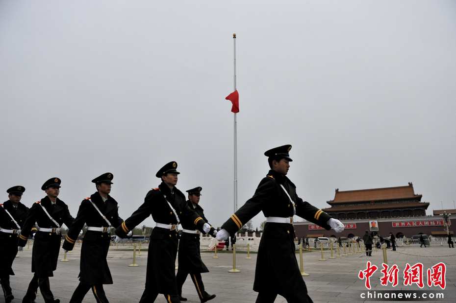 4月21日早晨,北京天安門廣場下半旗向玉樹地震遇難者致哀。中新網記者 金碩 攝