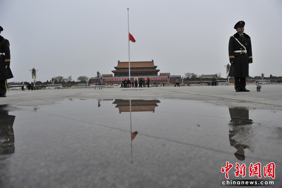 4月21日早晨,北京天安門廣場下半旗向玉樹地震遇難者致哀。中新網記者 金碩 攝