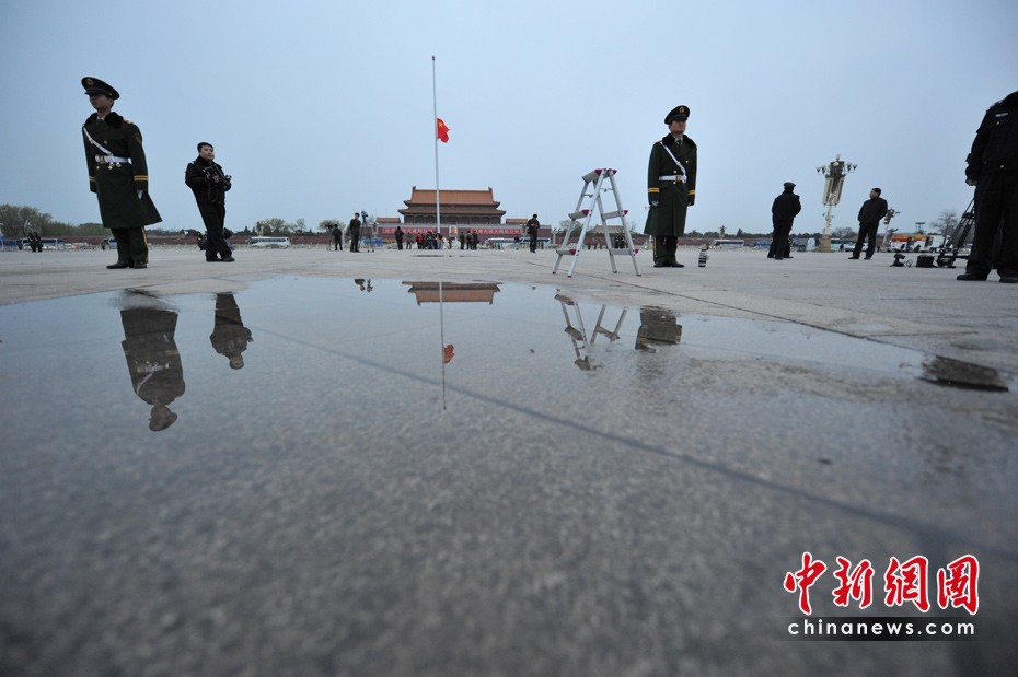4月21日早晨,北京天安門廣場下半旗向玉樹地震遇難者致哀。中新網記者 金碩 攝
