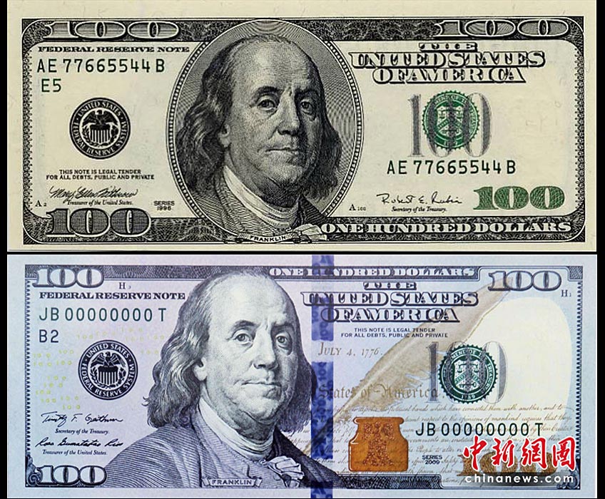 4月21日,美國財政部和美聯儲共同發布新版100美元面值的紙幣票樣。此次發行新版百元美鈔旨在防范假鈔,同時,老版美元仍將繼續流通。圖片來源:中國新聞網