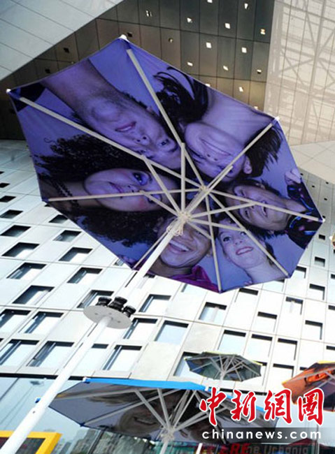 2010年4月22日,上海世博會主題館門前的觀眾等候區,豎立著一把把遮陽的花傘,每一把花傘上都印著四方友人的燦爛微笑。世博園區為了應對大量客流,園區設置了大量遮陽和避雨設施,遮陽避雨面積總量達40萬平方米。楊毅 攝