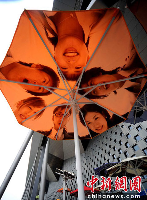 2010年4月22日,上海世博會主題館門前的觀眾等候區,豎立著一把把遮陽的花傘,每一把花傘上都印著四方友人的燦爛微笑。世博園區為了應對大量客流,園區設置了大量遮陽和避雨設施,遮陽避雨面積總量達40萬平方米。楊毅 攝(CFP)