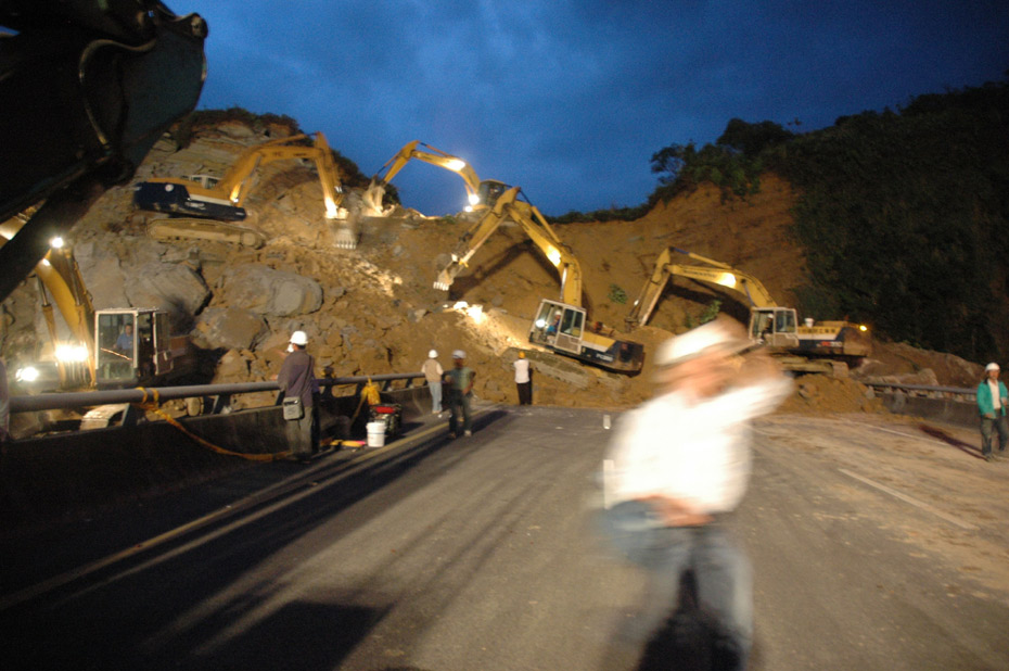 4月25日, 臺灣一條交通要道、“北二高”基隆段發生山崩意外,傾瀉而下的土石壓垮一座高架橋,并覆蓋道路約200米,據傳有人車被埋。圖為工程人員連夜開挖,展開大搜救。(圖片來源:“中央社”)。