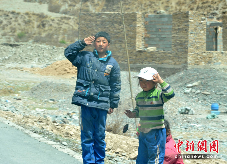 各地赴青海地震救援隊(duì)伍4月底前陸續(xù)撤回,玉樹通往西寧的214國道路邊,經(jīng)常可見有小學(xué)生向回撤的抗震救災(zāi)車隊(duì)人員舉手致敬。中新社發(fā) 賈國榮 攝