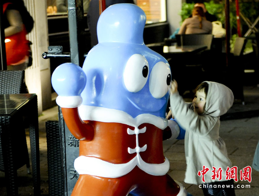 4月26日,一名外國小女孩在上海新天地的食肆內玩味世博會吉祥物海寶。世博會開幕在即,面臨“大考”的上海充滿喜慶氣氛。 中新社發 廖攀 攝