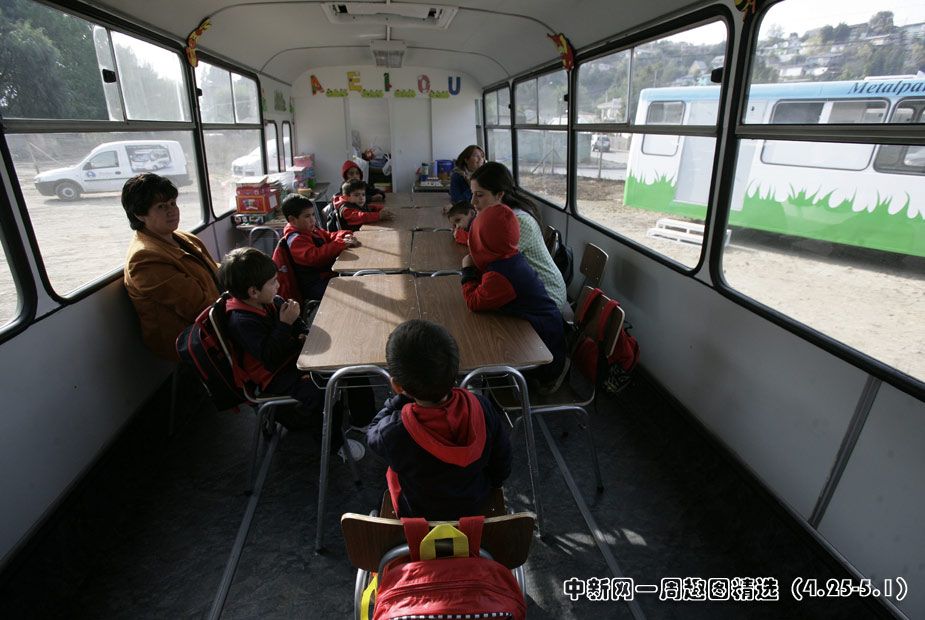 4月26日,今年2月遭受8.8級強烈地震的智利康塞普西翁市,兒童們在“巴士學!崩锷险n。圖片來源:中國新聞網>>點擊觀看詳細內容
