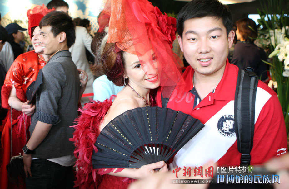 5月1日,上海世博會正式開園,在法國館內,美麗的法國少女熱情地接待著每一位進館參觀的游客。圖為法國美女與中國小伙“親密接觸”,盡顯法蘭西浪漫風情。中新社發 湯彥俊 攝