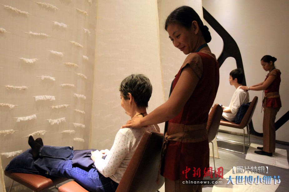 5月1日,上海世博會正式開園,當日有20萬人次的游客參觀了世博園。世博首日,許許多多的小細節都帶給人一種全新的體驗。圖為菲律賓館的傳統按摩。中新社發 潘索菲 攝