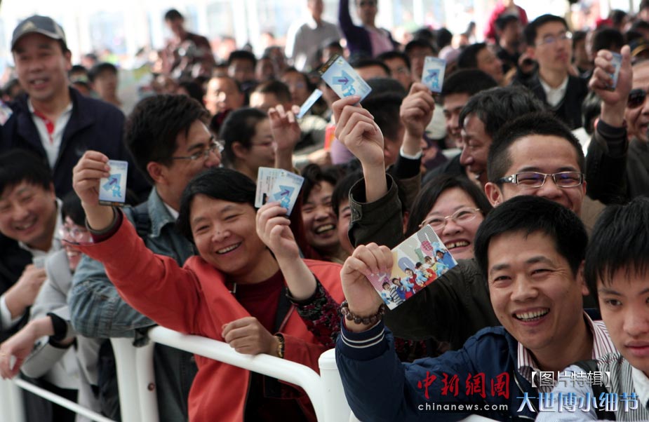 5月1日,上海世博會(huì)正式開園,當(dāng)日有20萬人次的游客參觀了世博園。世博首日,許許多多的小細(xì)節(jié)都帶給人一種全新的體驗(yàn)。圖為首批持票參觀者開心地展示參觀券。中新社發(fā) 袁云 攝