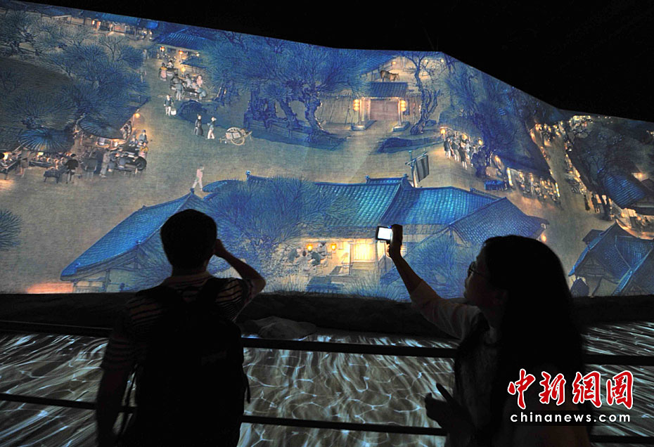 5月2日,中外觀眾依然最熱捧上海世博會中國館的“鎮(zhèn)館之寶”——巨幅放大電子動態(tài)版的北宋畫家張擇端名作《清明上河圖》。此世博版的《清明上河圖》高6.3米,長130余米,約是原圖的30倍,需要12臺電影級的投影儀同時工作。整個活動畫面以4分鐘為一個周期,盡展宋朝盛世的都市日夜風情。中新社記者 賈國榮 攝