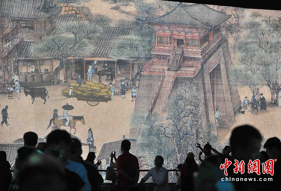 5月2日,中外觀眾依然最熱捧上海世博會中國館的“鎮館之寶”——巨幅放大電子動態版的北宋畫家張擇端名作《清明上河圖》。此世博版的《清明上河圖》高6.3米,長130余米,約是原圖的30倍,需要12臺電影級的投影儀同時工作。整個活動畫面以4分鐘為一個周期,盡展宋朝盛世的都市日夜風情。中新社記者 賈國榮 攝