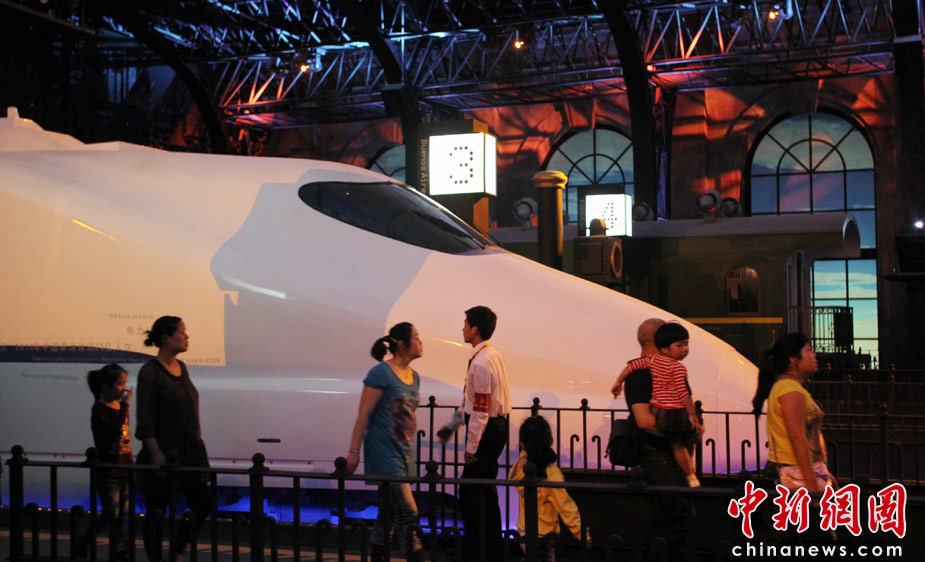 觀眾在上海世博會“城市生命館”參觀動車組模型。中國近年在動車交通方面發展迅速。設計師到世界各地考察后認為,一個城市只要通了火車,就開始有活力,成為城市發展的命脈。中新社發 蘇丹 攝