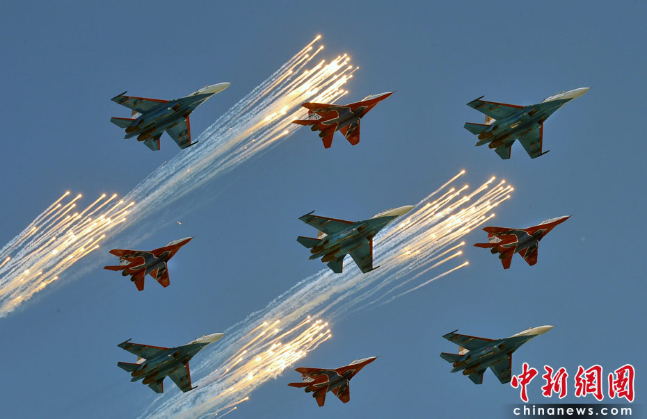 5月9日,俄羅斯在莫斯科紅場舉行盛大的閱兵式,慶祝衛國戰爭勝利65周年。莫斯科時間5月9日上午10點(北京時間9日下午2點)許,閱兵式正式開始。圖為空中梯隊飛越紅場上空。