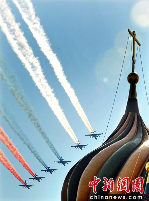 5月9日,俄羅斯在莫斯科紅場舉行盛大的閱兵式,慶祝衛(wèi)國戰(zhàn)爭勝利65周年。莫斯科時間5月9日上午10點(北京時間9日下午2點)許,閱兵式正式開始。圖為空中梯隊飛越紅場上空。