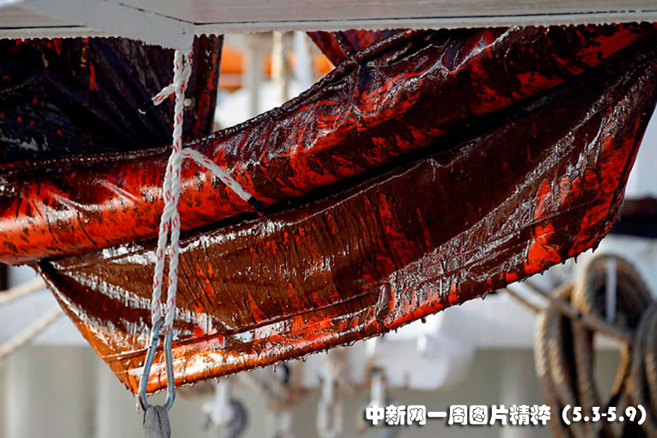 5月6日周四,在路易斯安那州Breton Sound,被石油浸過的帆掛在一艘捕蝦船上。工人們周四打算將一個100噸的鋼筋水泥罩放入海底,希望以此封堵墨西哥灣油井的大部分石油泄漏。