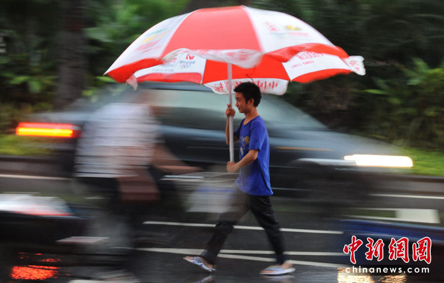 未來三天,青藏高原中東部、西南地區、江漢、江淮、江南、華南等地將持續陰雨天氣,其中,廣西南部、廣東大部、江西南部、福建南部、海南西北部、湖北大部、湖南北部、重慶大部等地有大雨或暴雨,局地有大暴雨。圖為5月9日傍晚,佛山市禪城區文華北路,一位市民撐著一個大傘過馬路。崔景印攝(CFP)