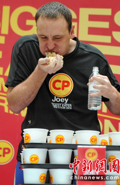 5月9日,新加坡舉行了一場別開生面的世界吃餛飩大賽,來自全球各地的多名大胃王在比賽中一較高下。最終在8分鐘內(nèi)狂吞380個的美國選手獲得了冠軍。圖為最終獲得冠軍的美國選手。