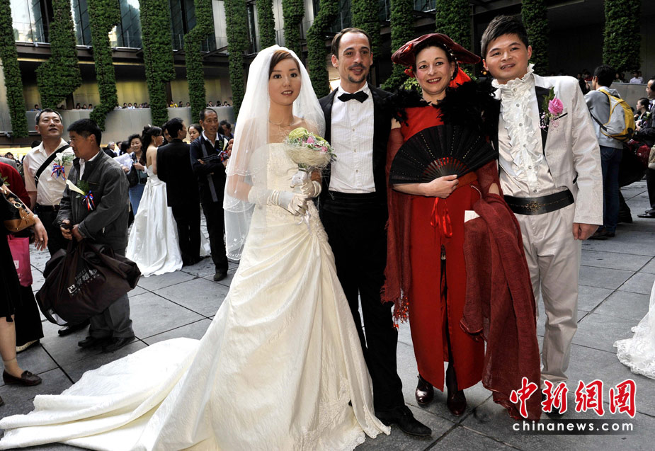 5月11日,35對新人來到世博法國館內舉行婚禮儀式。法國館舉行“法蘭西浪漫婚典”的集體婚禮。中新社發 吳元峰 攝