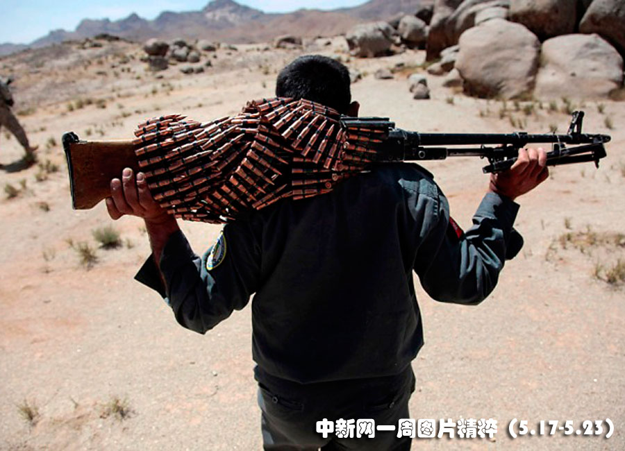 5月20日在阿富汗坎大哈,一名阿富汗國民警察扛著一挺機關槍和美國士兵一起巡邏。