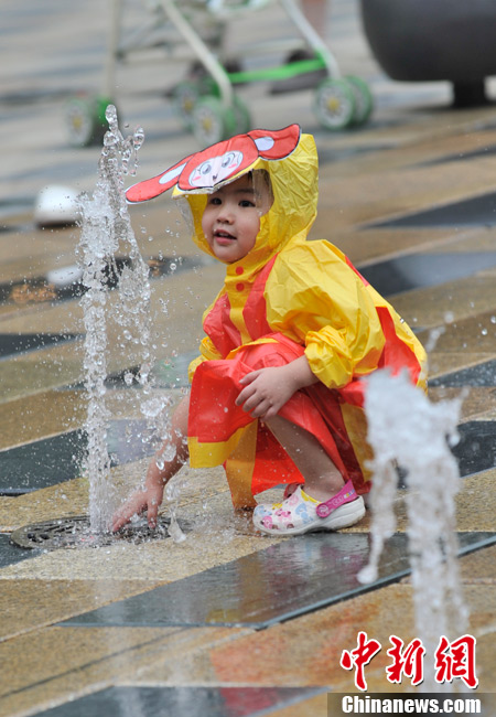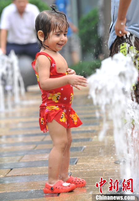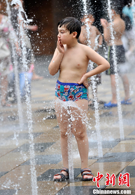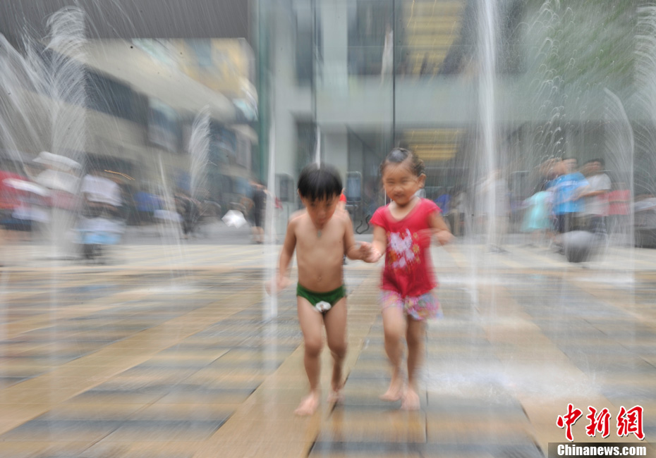 近日,北京持續的高溫使“桑拿天”的感覺越來越強烈。中央氣象臺繼續發布高溫藍色預警,預計未來三天,新疆吐魯番盆地和南疆盆地、甘肅西部、內蒙古大部有35-37℃的高溫天氣,新疆吐魯番盆地、內蒙古中西部的部分地區最高氣溫可達42℃以上;陜西東北部、山西北部、河北中西部、北京大部、天津西部、重慶大部、江南中西部等地有35℃以上的高溫天氣,局地最高氣溫可達37~38℃。圖為7月26日北京三里屯一處噴泉引來許多中外小朋友戲水享清涼。中新網記者 金碩 攝