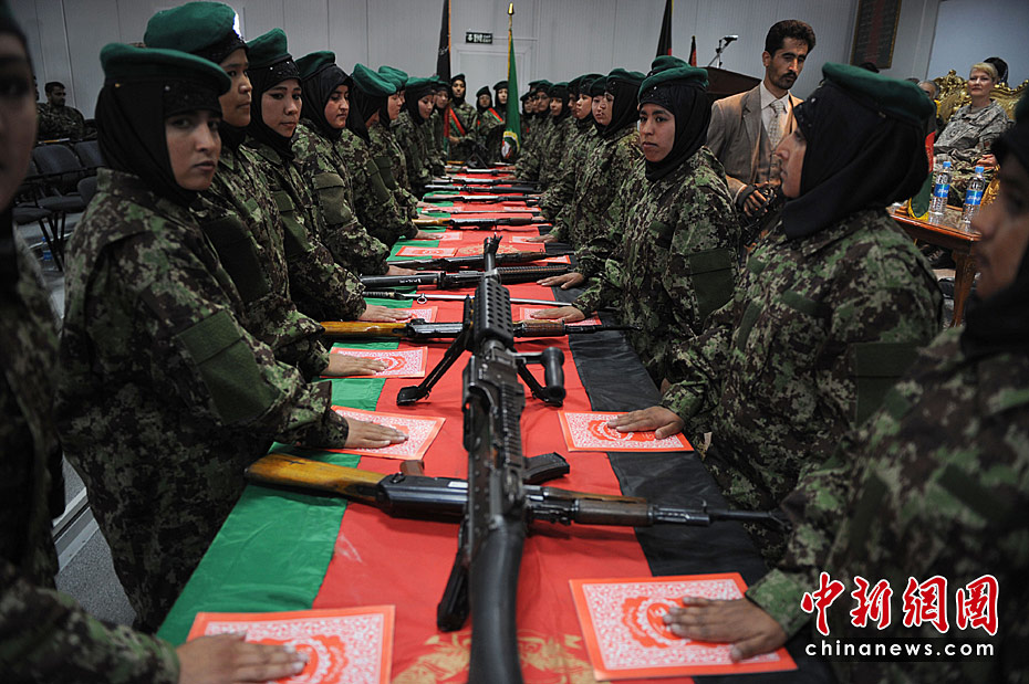 當地時間5月27日,阿富汗首批女軍官在首都喀布爾舉行畢業宣誓儀式。這是阿富汗軍隊征召女兵計劃的一部分,按照計劃她們將根據各自受教育程度被賦予不同的職位:接受過12年以上教育的女兵將擔任文職官;接受過9年到11年教育的將擔任軍士長;受教育程度更低的女兵則只能當列兵。圖片來源:中國新聞網