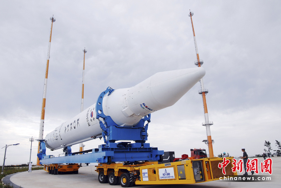 韓國首枚運(yùn)載火箭“羅老”號6月9日將再次發(fā)射升空。羅老號曾于去年8月25日第一次發(fā)射升空,但由于衛(wèi)星保護(hù)整流罩未能分離,最終未能進(jìn)入正常軌道。圖為6月7日,韓國“羅老”號運(yùn)載火箭運(yùn)往全羅南道羅老航天中心。