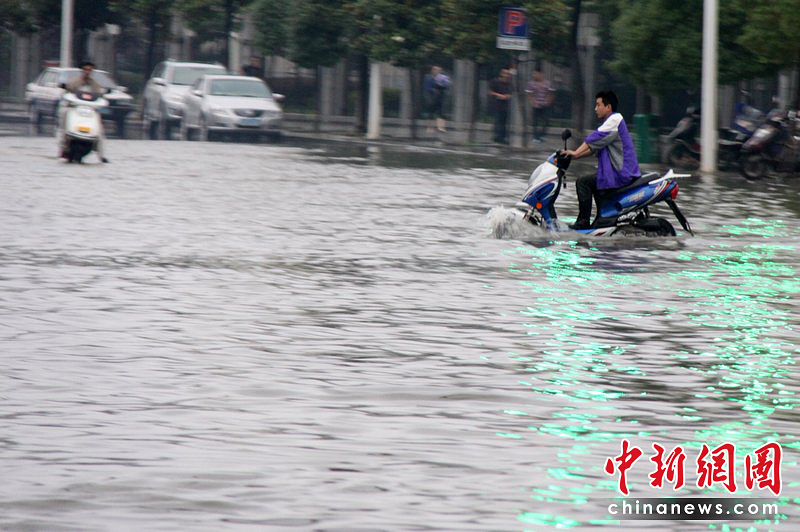 6月8日,在江西瑞昌市街頭,行人在積水中艱難前行。自6月7日夜間開始,江西九江市持續遭受暴雨襲擊,各縣、區24小時的平均降雨量在80毫米左右,最大降雨量在廬山區達到134毫米。魏東升 胡國林/CFP