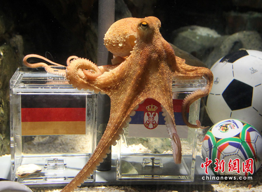當地時間6月15日,德國北部,水族館里的海洋生物爭搶填滿飼料的足球。