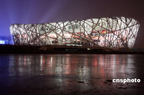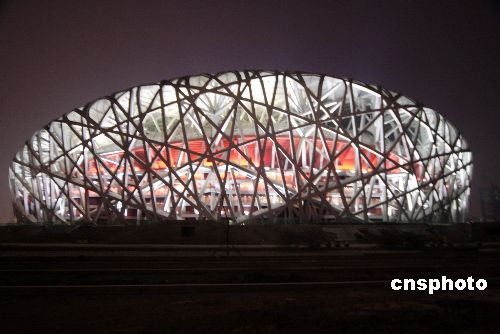 2月4日晚,北京“鳥巢”的鋼結構照明“點亮”。在照明燈下,內墻上的“中國紅”透過灰色“鳥巢”鋼結構,非常迷人。據了解,除夕之夜以及春節期間,市民可以看到“鳥巢”的燈景。中新社發 吳芒子 攝