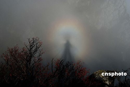 11月4日,廬山出現(xiàn)蔚為壯觀的云海,同時連續(xù)三次出現(xiàn)神奇的“佛光”,每次時間長達(dá)一小時左右,令來廬山的許多中外游客和攝影師們大飽眼福。廬山位于長江中游南岸江西省九江市南,鄱陽湖濱,大山、大江、大湖渾然一體,素以“雄、奇、險、秀”聞名于世。圖為4日廬山五老峰上出現(xiàn)的神秘的“佛光”奇觀。中新社發(fā) 胡國林 攝