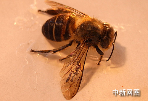 臺灣著名微雕家陳逢顯最近在一只蜜蜂標本的翅膀上寫下了金庸武俠小說《神雕俠侶》中的一句話“過兒吾愛,我在絕情谷底,小龍女筆”十四個微小字。圖為作品。中新社記者 陳立宇 攝