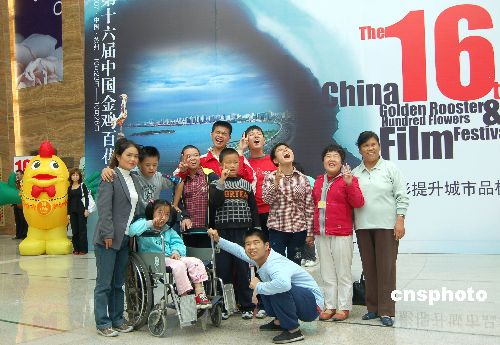 10月26日,蘇州市平江區培智學校組織近百名殘疾兒童到蘇州“鳥巢”——科技文化中心,感受正在舉行的第十六屆中國金雞百花電影節。圖為殘疾兒童在老師的陪同下高興地在電影節吉祥物前合影留念。中新社發 邱勇 攝
