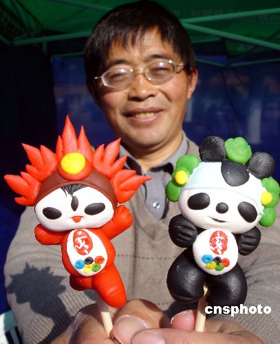 2007年12月5日,蘇州面塑藝人呂樹華用一雙巧手捏出的奧運(yùn)福娃造型面塑作品,形象逼真、可愛,表達(dá)了他對2008年奧運(yùn)會的美好祝愿。中新社發(fā) 王建康 攝