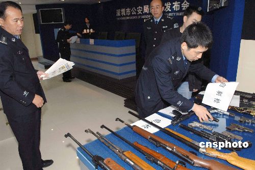 深圳警方一月三日對外發布消息,在近期開展的治爆緝槍專項行動中,再次收繳一批管制刀具、仿真槍支,破獲一批涉槍涉爆犯罪案件。中新社發 陳文 攝