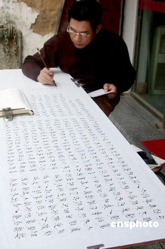 2008年初,被譽為“倒影王”的廣東惠州市博羅縣居民唐天華用了歷時三年的時間,完成了倒影字書法作品《紅樓夢》,共計75萬字,使用宣紙1018張,對齊擺放起來共1832.4米起長。中新社發 宋秀杰 攝