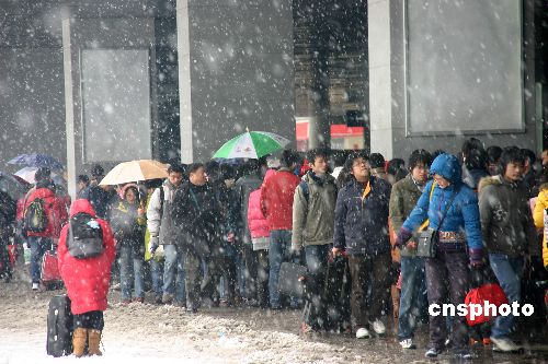 2008年1月26日,南京出現入冬以來最大幅度的降溫和雨雪天氣,受通往外地的高速公路全部關閉的影響,南京火車站迎來春運以來的最大客流量,前來購票的旅客一直排到站外廣場,交警和武警官兵也協助車站方面維護秩序。中新社發 阿董 攝