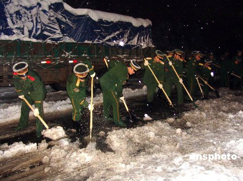 1月28日下午16時(shí),武警江蘇總隊(duì)1500余名官兵緊急奔赴南京長江二橋除雪抗災(zāi)。南京長江二橋是南北交通大動(dòng)脈,更是向南京市區(qū)運(yùn)輸新鮮農(nóng)產(chǎn)品的主要通道,每天車流量達(dá)到5萬余次。暴雪已使二橋交通中斷,近兩千車輛被迫停泊在風(fēng)雪中。截至1月29日凌晨2時(shí)許,經(jīng)過武警官兵連續(xù)10多個(gè)小時(shí)的艱苦奮戰(zhàn),約30公里的高速公路重新暢通。 中新社發(fā) 唐占軍 攝