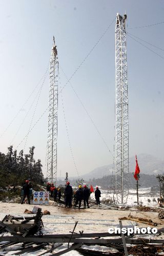 一座塔倒下去,又一座塔立起來,湖南望城縣橋驛鎮(zhèn)月塘村華沙線500千伏塔,電力工人羅海文、羅長明、周景華不幸遇難的送變電倒塌電塔現場,經過湖南省送變電建設有限公司三分公司140多職工和120名武警官兵日夜搶修,2月3日,在原41號鐵塔的廢墟上立起了一座新塔。另外44、43號倒塌的鐵塔也在近日修復。中新社發(fā) 殷中民 攝