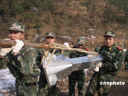 2月8日,湖南省婁底市武警支隊100多名武警官兵冒著風(fēng)雪和山高路滑,每天將近20噸電力鐵塔的部件分散運送到湘鄉(xiāng)市壺天鎮(zhèn)山上進行線路搶修。中新社發(fā) 郭國權(quán) 攝