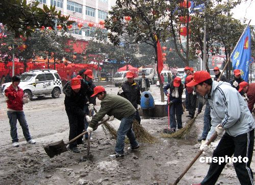 春節期間,河北、安徽、遼寧、貴州等八省市200余名西部志愿者冒冰雪赴貴州210國道和205省道福泉市段公路上,參與除冰雪保暢通為民服務活動。 中新社發 易勝武 攝