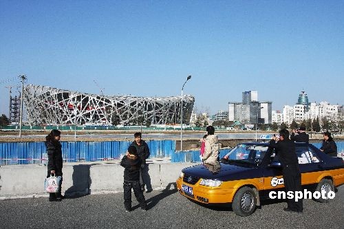 2月16日,位于國家體育場--鳥巢南側的北辰橋上大批市民在拍照留念,形成一道獨特的風景線。因高架橋上視野開闊,角度頗佳,所以吸引了眾多拍照者在此駐足留影。圖為一出租車司機也停車在此拍照欣賞一番這獨特的風景。中新社發 鄭雄增 攝