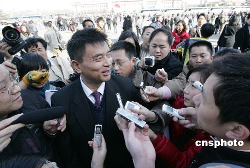 三月三日下午,全國政協十一屆一次會議在北京人民大會堂開幕,著名民營企業家劉永好委員在大會堂前答記者問。中新社發 毛建軍 攝