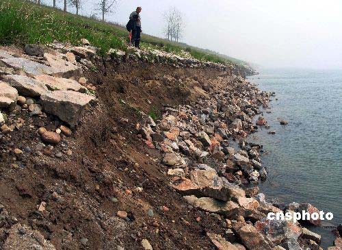 2008年3月18日,枝江市白洋鎮向家壩沙灣堤外垸,崩塌的長江堤防。據悉,自3月10日以來,湖北枝江市白洋鎮向家壩沙灣堤外垸長江堤防連續發生崩塌。該處垸堤長1750米,崩長360米,崩坎平均高1.5米至3.5米,最高處達5米;垸內有14戶人家,耕地183畝。據專家分析,該堤段崩岸主要原因是:一、清水下泄,崩岸處正處清江河口對岸,迎流頂沖,護坡腳槽形成吊坎后崩垮;二、長江近年處在中低水位運行,護坡處淤沙沖失后未及時維護。目前,枝江正在組織勞力、機械、石源對該段進行突擊整治,力爭汛前全面脫險。中新社發 劉君鳳 攝
