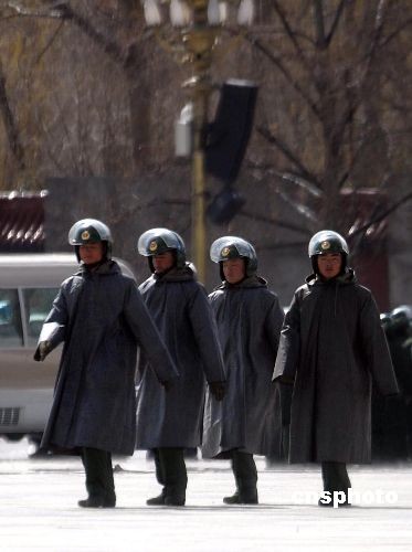 3月21日,武警在拉薩布達拉宮廣場上執勤。當日,拉薩市區降下一場中雪。中新社發 廖攀 攝