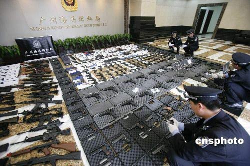 3月21日消息,廣州海關緝私局宣布,兩年前經過艱苦偵查,成功破獲了一個專門從事走私仿真槍的犯罪團伙,該起案件案值逾五百萬元人民幣,走私進口數量逾三千支。近日,廣州市中級人民法院對該案作出一審判決:以走私普通貨物罪分別判處譚某等十名被告有期徒刑六年到二年不等。圖為2006年破案后,海關關員清點走私仿真槍支。中新社發 陳國華 攝